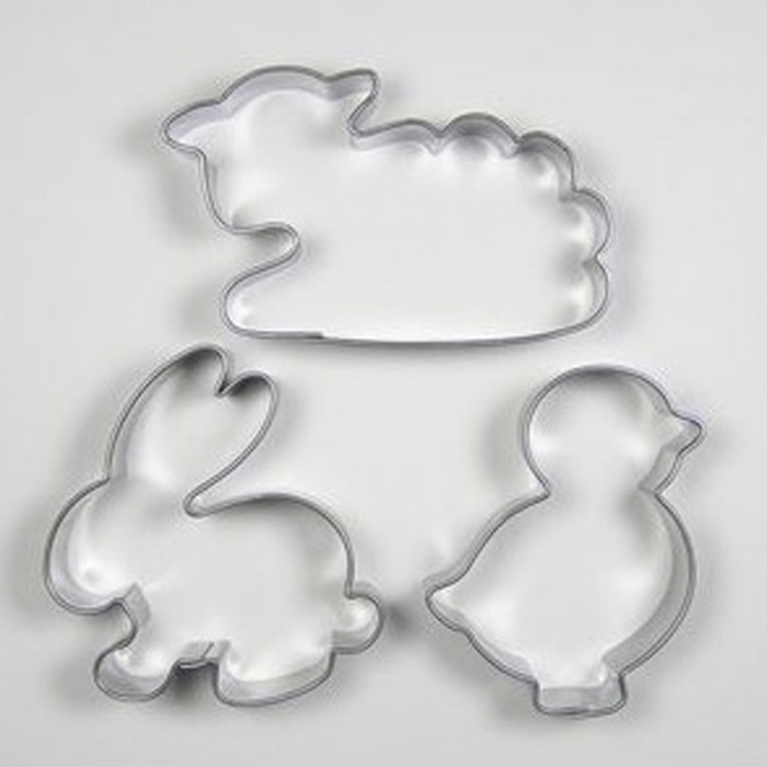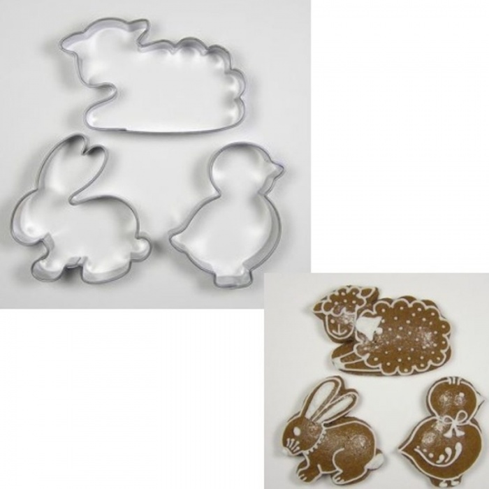 Sada kovové formičky na vykrajování cukroví ve tvaru kuře, beránek a zajíc je perfektní pro velikonoční pečení, ale i výrobu dekorací.