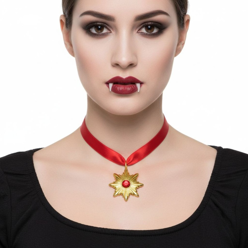 Červená stuha, na které je medailon zavěšen, dokonale ladí s červeným kamenem a přidává na dramatičnosti celkového vzhledu. Tento doplněk je perfektní volbou pro Halloween hororové párty, tematické akce nebo jakoukoli událost, kde chcete vyniknout a zaujmout svou originalitou.