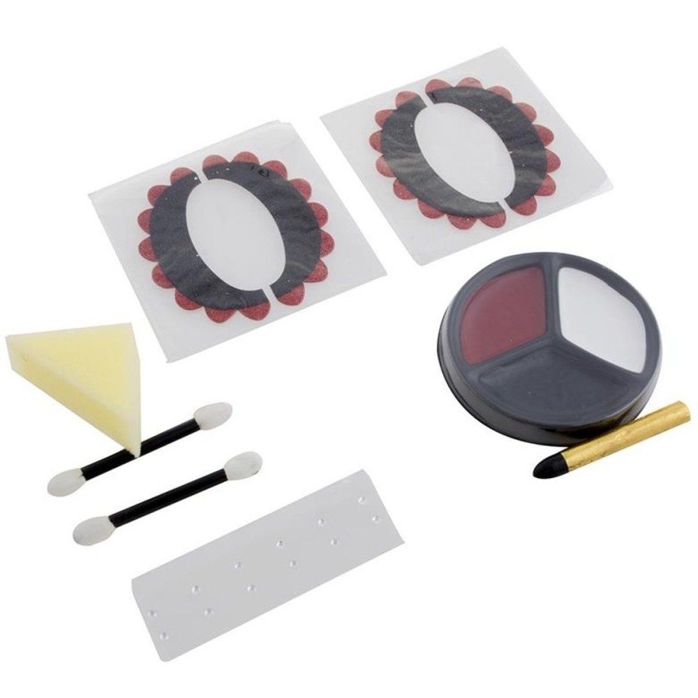Karnevalová sada barev na obličej pro mexický svátek Den mrtvých obsahuje vše, co potřebujete pro autentické líčení. V balení najdete houbičku, nálepky kolem očí, drobné nalepovací kamínky, aplikátor, barevnou tužku a tři různé barvy krémového líčidla.