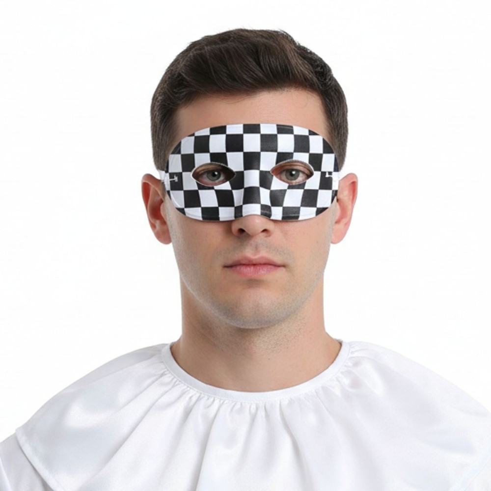 Černobílá škraboška se šachovnicovým motivem je stylovým karnevalovým doplňkem, který vynikne na každém maškarním plese. Skvěle se hodí ke kostýmům jako pierot nebo harlekýn a dodá jim autentičnost.
