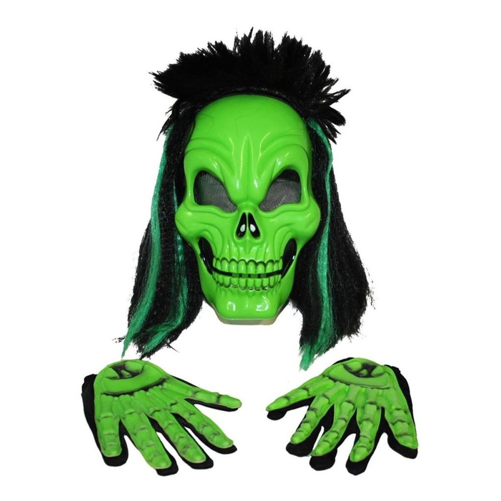 Maska lebka s vlasy a rukavice připomínající kostnaté ruce jsou ideálním doplňkem pro všechny, kteří chtějí na Halloween nebo strašidelnou párty vyniknout. Tento set skvěle doplní kostým smrtky nebo kostlivce, čímž dodá vašemu převleku autentičnost a děsivý efekt.
