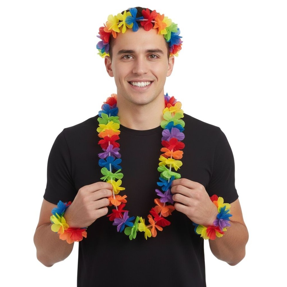 Sada havajských květinových věnců je perfektním karnevalovým doplňkem, který zahrnuje věnec na krk, hlavu a dva náramky. Skvěle doplní maškarní kostým ve stylu havajské tanečnice a přidá barevný akcent na aloha nebo duhovou pride párty.