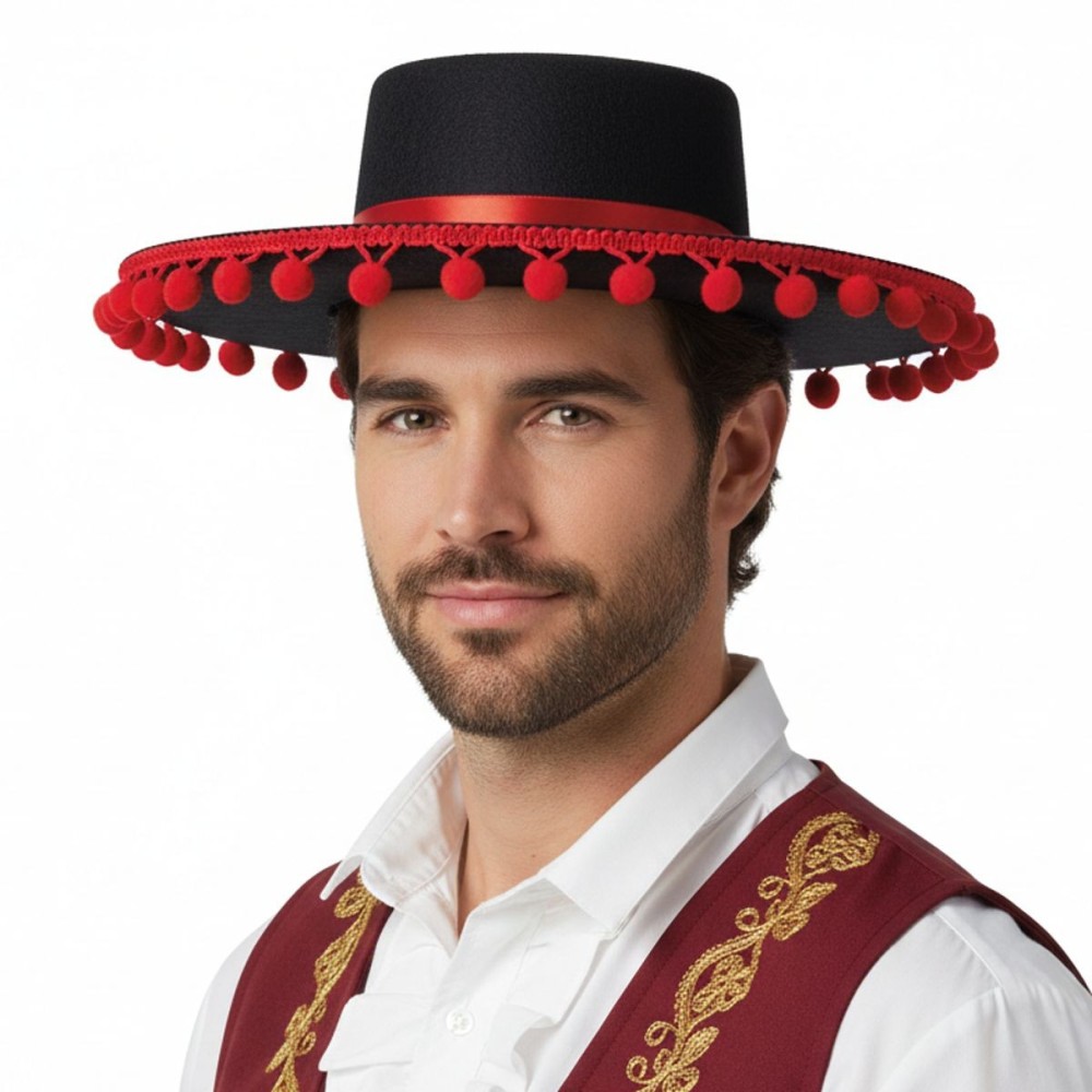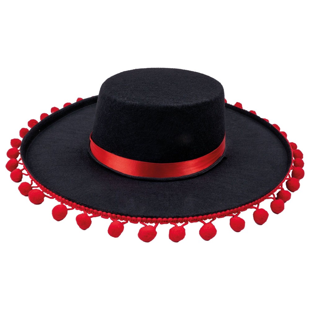Stylový černý španělský klobouk s červenými bambulkami je perfektním doplňkem pro karnevalové kostýmy Španěla či Španělky. S vnitřním obvodem cca 58 cm zajišťuje pohodlné nošení pro dospělé.