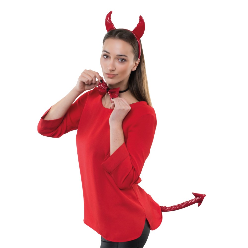Stylový karnevalový set pro kostým čerta i čertice obsahuje čelenku s rohy, motýlka a ocas z kvalitní umělé kůže s jemným leskem. Skvěle doplní maškarní převlek na Mikuláše, vánoční párty, Halloween i tematické večírky.