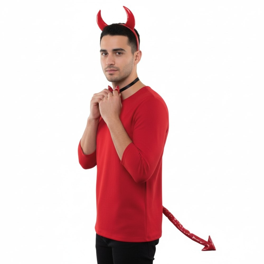 Karnevalový set čert – čelenka s rohy, motýlek a ocas; univerzální velikost, snadné nasazení, ideální na Mikuláše, Halloween i maškarní párty.