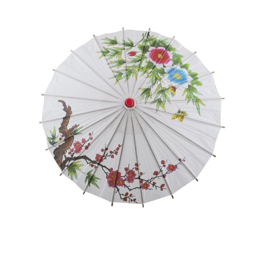 Krásně zdobený asijský deštník je vyroben z kvalitního bambusu a papíru, což zaručuje jeho autentický vzhled a odolnost. S průměrem 60 cm je ideálním doplňkem pro maškarní kostýmy inspirované japonskou či čínskou kulturou.