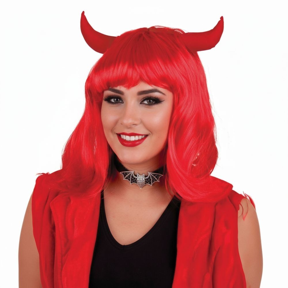 Červená paruka s rohy čertice - Tento výrazný doplněk je ideální pro kostým čertice na Mikuláše, maškarní karneval a tematické oslavy. Paruka s rohy dodá vašemu vzhledu dramatický a zábavný efekt.