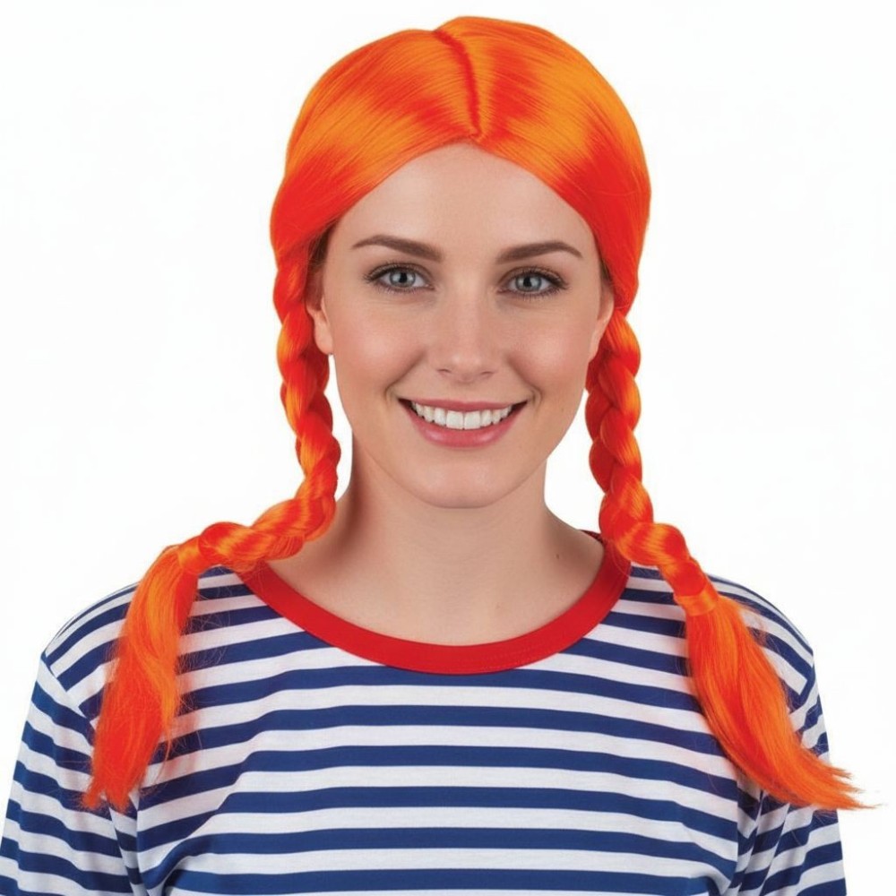 Karnevalová dámská paruka v oranžové barvě s copy je perfektním doplňkem pro kostým Pipi Dlouhé punčochy. Tato paruka dodá vašemu vzhledu hravost a originalitu, ideální pro tematické maškarní večírky.
