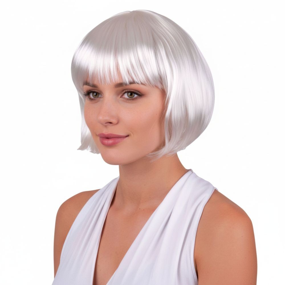 Karnevalová dámská paruka - bílé mikádo. Tato elegantní paruka v bílé barvě s klasickým mikádo střihem je perfektním doplňkem pro různé kostýmy na maškarní bály a tematické večírky.