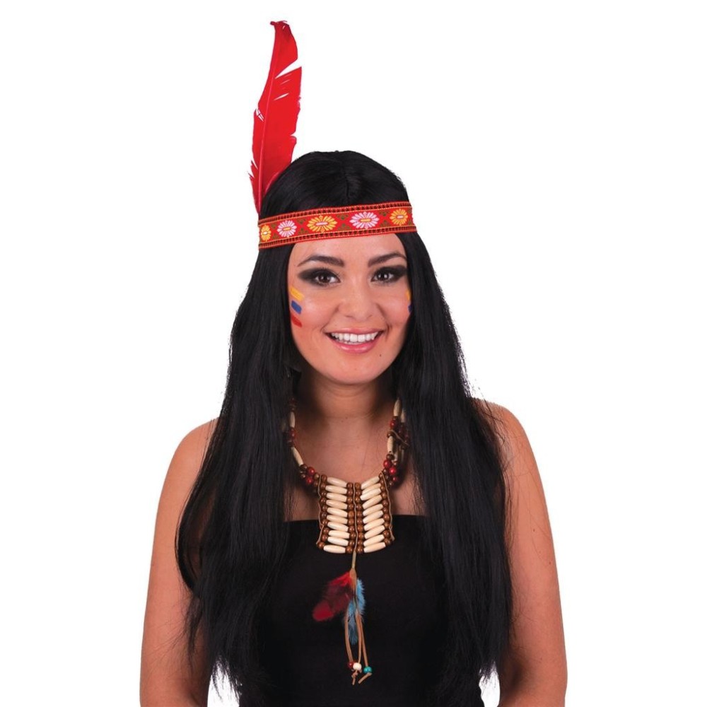 Karnevalová dospělá černá paruka s indiánskou barevnou čelenkou a pérem je perfektním doplňkem pro kostým indiána nebo indiánky. Tato paruka dodá vašemu vzhledu autentický a stylový nádech, ideální pro maškarní plesy či westernové párty.