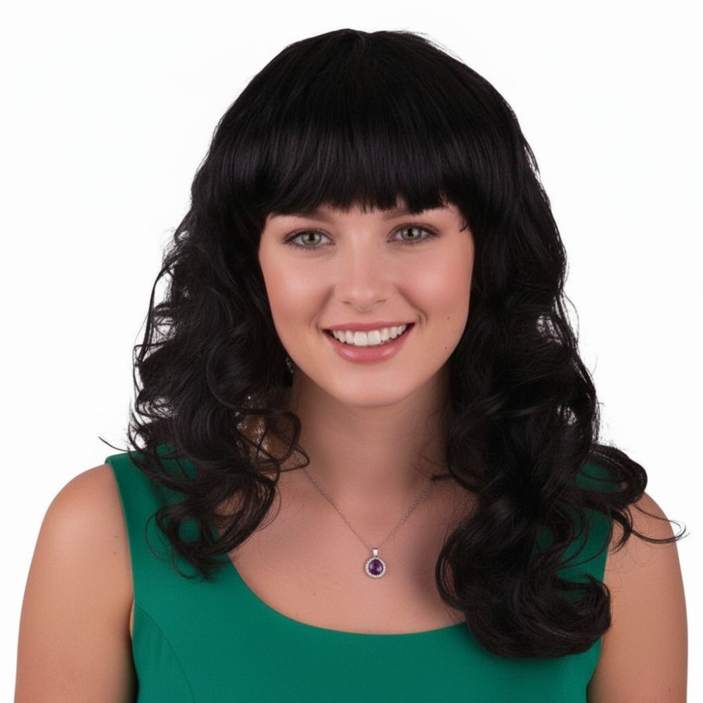 Karnevalová dámská vlnitá černá paruka s ofinou je ideálním doplňkem pro kostýmy princezen, královen, Španělek, víl. Je navržena tak, aby pohodlně seděla a dodala vašemu vzhledu elegantní a tajemný nádech.