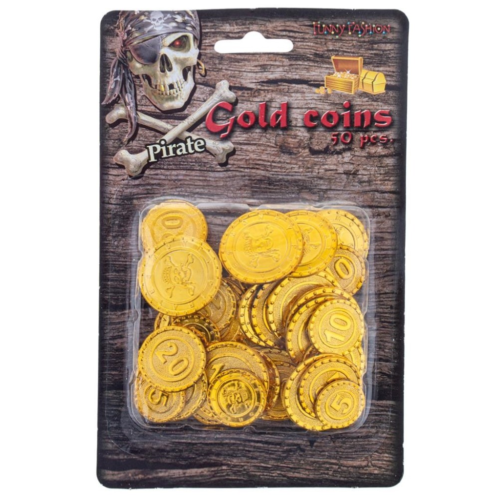 Karnevalový doplněk sada 50 kusů plastových mincí ve zlaté barvě a v různých velikostech. Skvěle doplní karnevalový kostým piráta, pirátky nebo jako originální dekorace na pirátskou oslavu.