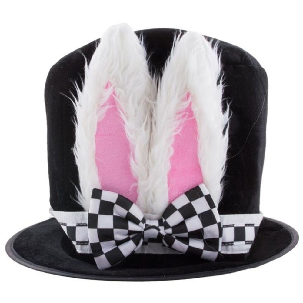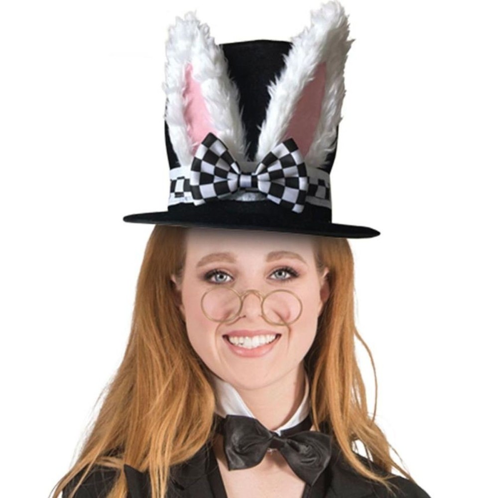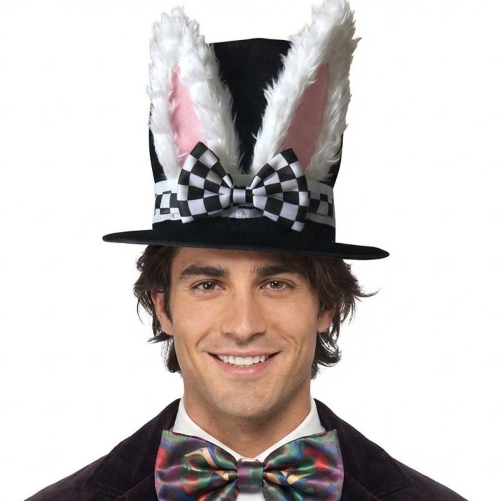 Karnevalový doplněk v podobě látkového černého cylindru je ozdoben bílými králičími ušima a kostkovaným motýlkem, což ho činí ideálním pro maškarní kostým králíčka, zajíčka nebo kloboučníka.