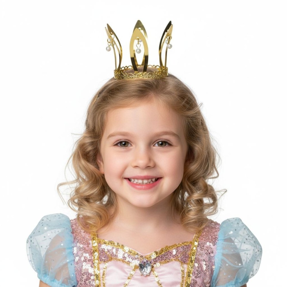 Kovová korunka ve zlaté barvě, zdobená perličkami a opatřená gumičkou kolem hlavy, je elegantním karnevalovým doplňkem, který dokonale doplní kostým princezny či královny. Tato korunka, o velikosti přibližně 7 x 7 cm, přidá vašemu kostýmu nádech královského šarmu a luxusu.