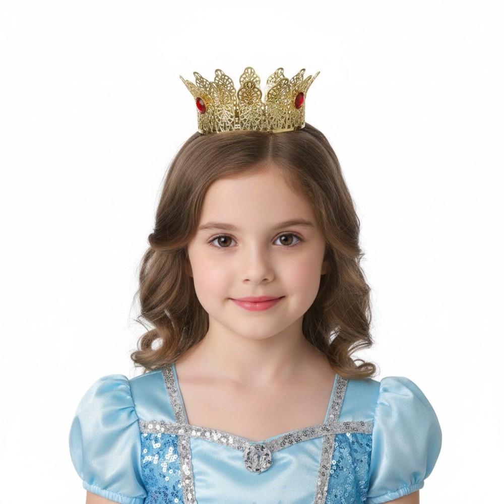 Kovová korunka ve zlaté barvě, zdobená výraznými červenými kameny, je ideálním karnevalovým doplňkem pro kostýmy princezen a královen. Díky praktické gumičce kolem hlavy je nošení pohodlné a stabilní, což z ní činí perfektní volbu pro stylové pohádkové párty.