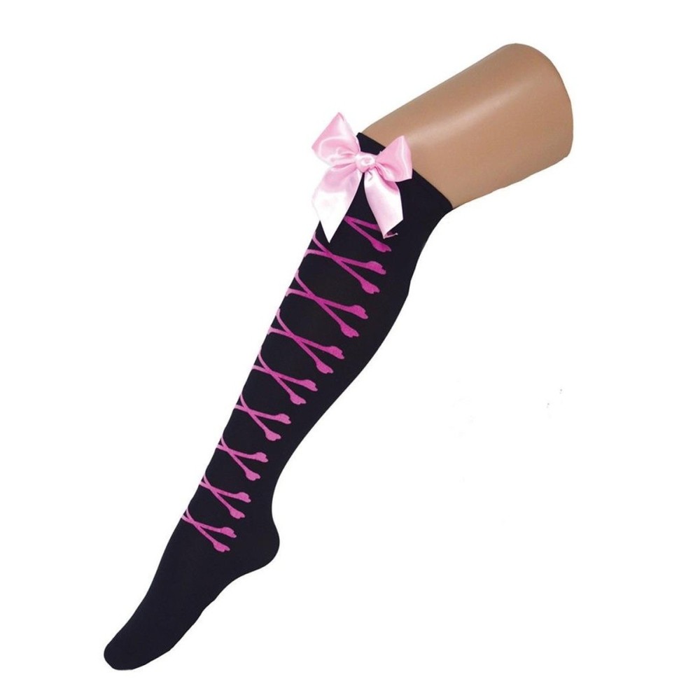 Černé punčocháče nadkolenky s růžovou mašlí a potiskem kostí jsou ideálním doplňkem pro karnevalové kostýmy, které potřebují nádech elegance a svůdnosti.