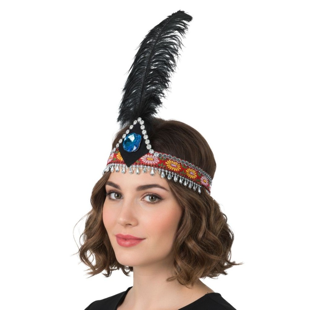 Krásně zdobená retro čelenka s černým pérem je ideálním doplňkem pro každý maškarní retro kostým. Perfektně se hodí pro flipper girl tanečnice nebo na stylovou mafie párty ve stylu 20. a 30. let.