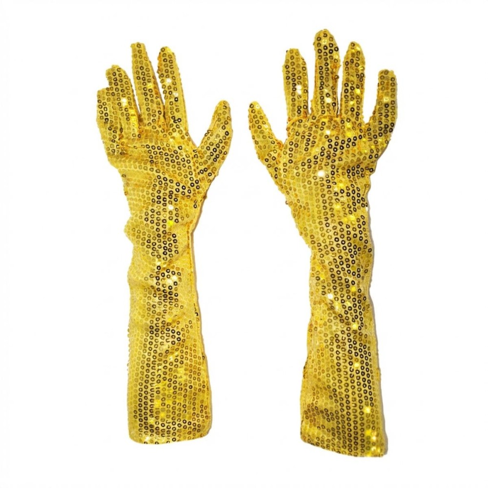 Dlouhé žluté dámské třpytivé rukavice se zlatými flitry jsou dokonalým doplňkem pro každou karnevalovou nebo stylovou retro párty. S délkou 45 cm a univerzální dospělou velikostí poskytují nejen pohodlí, ale také přidávají elegantní lesk každému kostýmu.