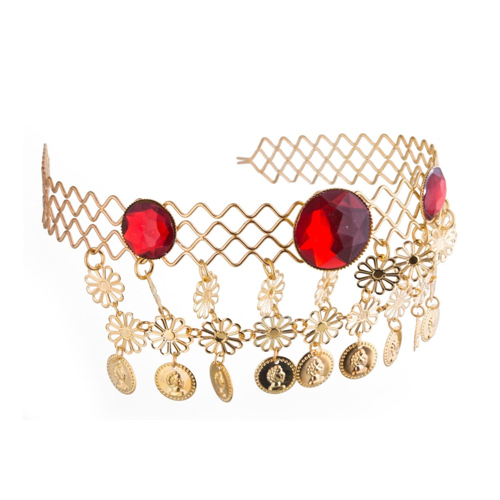 Kovová čelenka s kameny a mincemi je perfektním doplňkem pro každý maškarní kostým inspirovaný arabskou kulturou. Skvěle se hodí pro arabské princezny, Jasmíny, Šeherezády, břišní tanečnice ale i Kleopatry nebo na stylovou Arab Egypt párty.