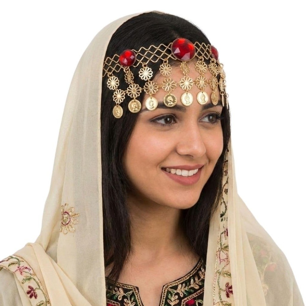 Kovová čelenka s kameny a mincemi je jedinečným karnevalovým doplňkem, který dodá vašemu kostýmu exotický a elegantní vzhled. Tato čelenka je inspirována tradičními arabskými šperky a je ideální pro všechny, kteří chtějí vyniknout na maškarních večírcích či tematických akcích.