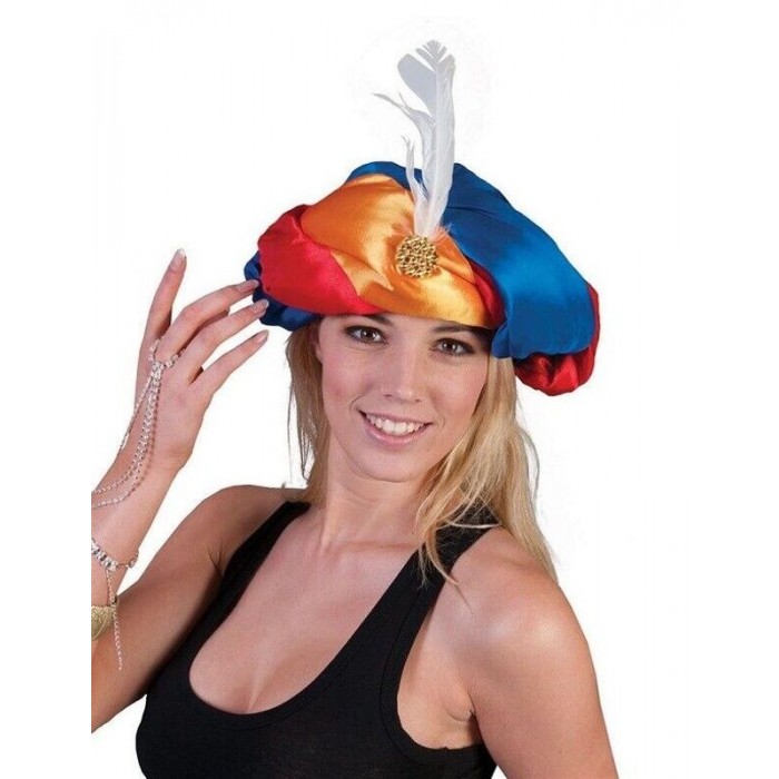 Barevný látkový turban se zlatou ozdobou a pérem je ideálním karnevalovým doplňkem pro vytvoření autentického vzhledu sultána, Turka, Džina nebo šejka. Tento turban v dospělé velikosti je navržen tak, aby pohodlně seděl a dodal vašemu maškarnímu kostýmu nádech exotiky a luxusu.