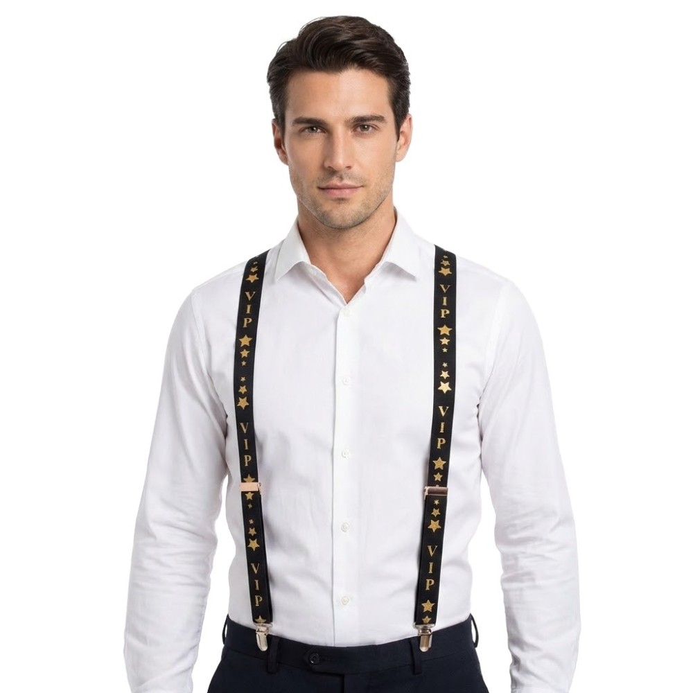 Černé kšandy šle s motivem VIP jsou skvělým karnevalovým doplňkem, který dodá vašemu retro kostýmu ten správný šmrnc. Jsou navrženy v dospělé velikosti, což zajišťuje pohodlné nošení pro každého, kdo chce vyniknout na tematické párty nebo karnevalu.