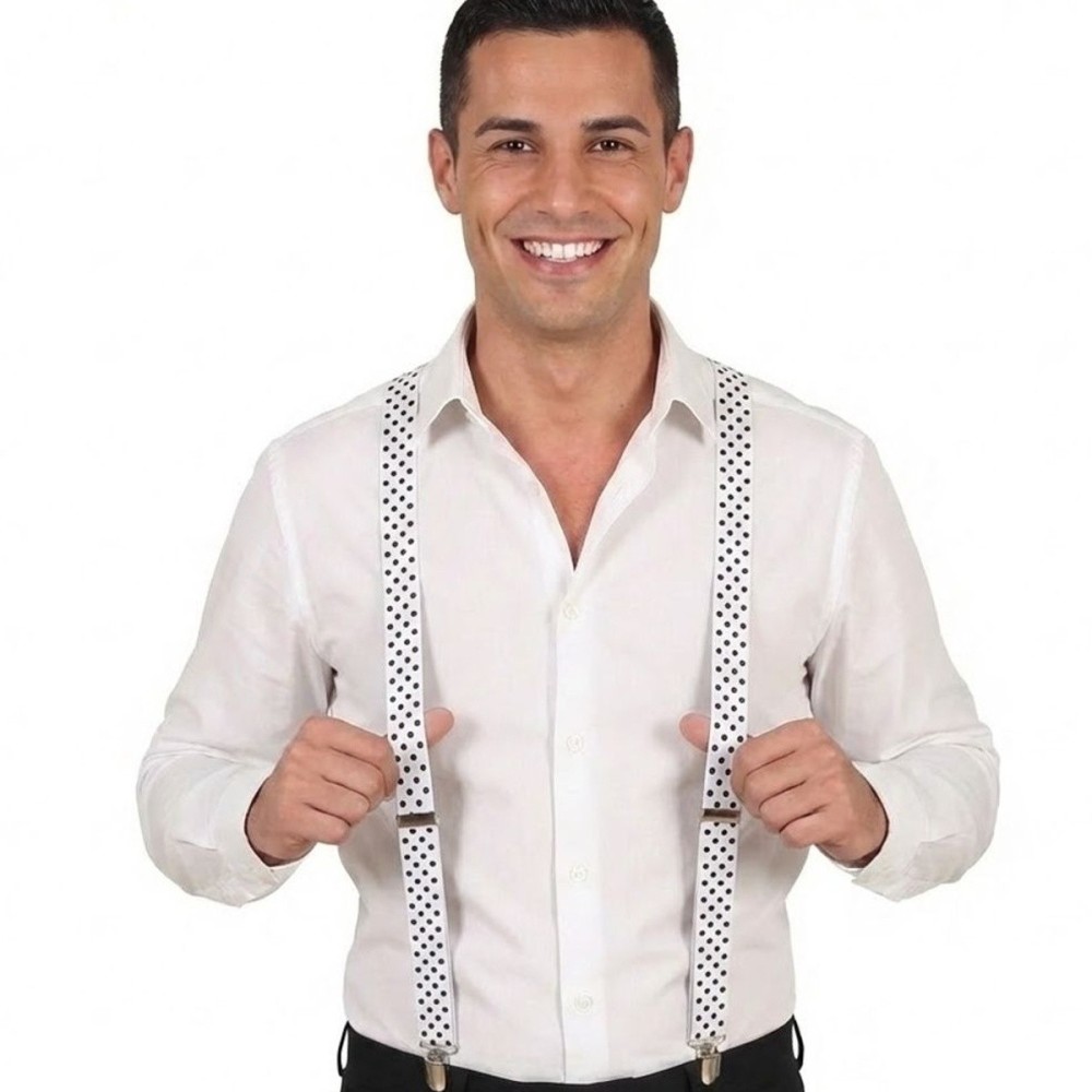 Bílé kšandy s černými puntíky tzv. polka dots, jsou perfektním karnevalovým doplňkem, který dodá vašemu retro kostýmu autentický vzhled. Díky dospělé velikosti zajišťují pohodlné nošení a skvěle drží.