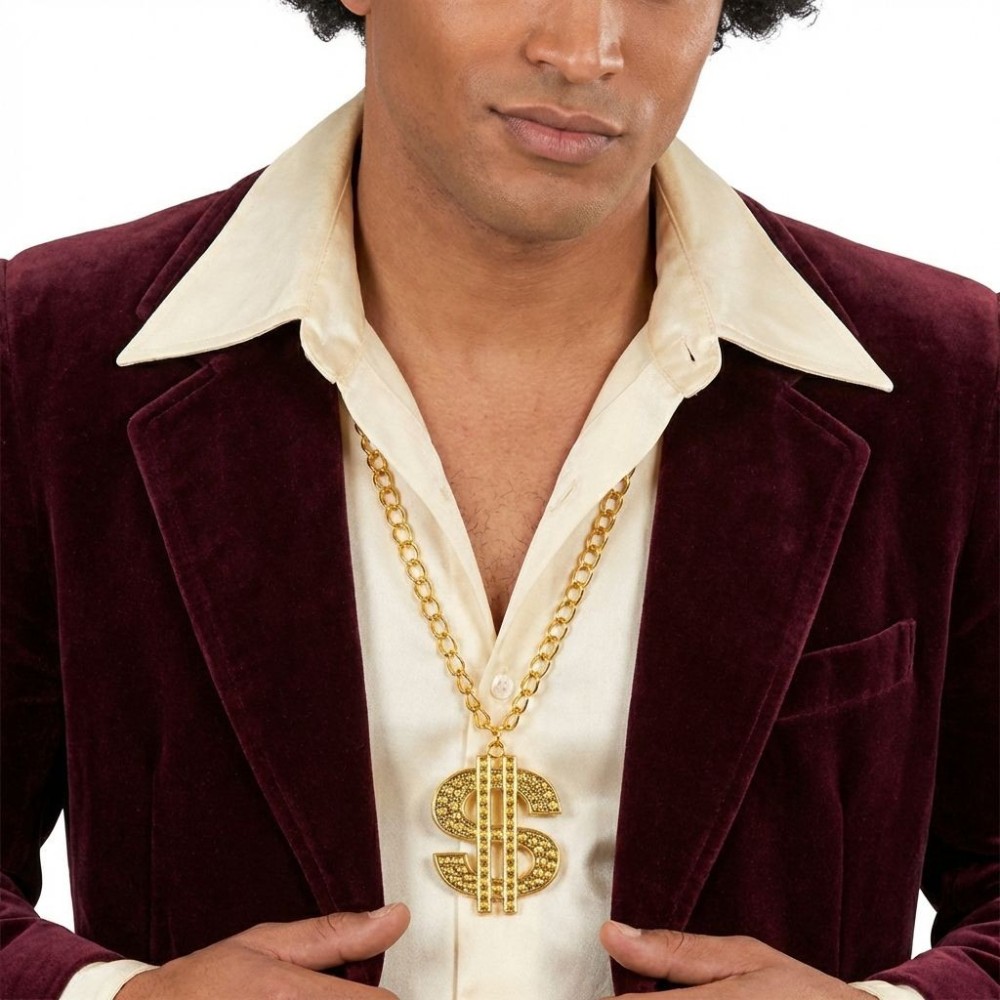 Kovový řetízek se zlatým symbolem dolaru je skvělým doplňkem pro ty, kteří chtějí svému kostýmu mafiána nebo outfitu na stylovou párty dodat výrazný a luxusní vzhled. Tento řetízek, s délkou 50 cm, je zakončen přívěskem o rozměrech 7 x 5,5 cm, který přitahuje pozornost a dodává vašemu stylu nádech extravagance.