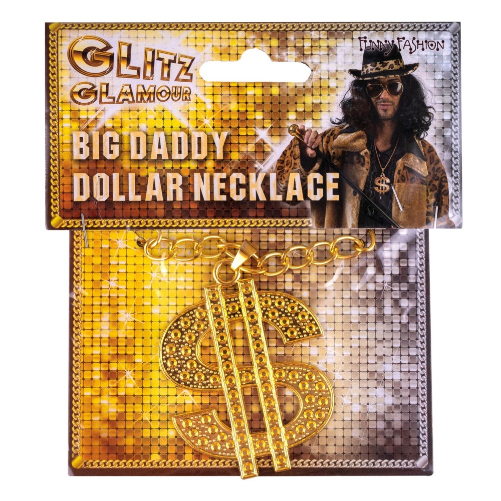 Kovový řetízek se zlatým symbolem dolaru je ideálním doplňkem pro retro kostýmy či stylové párty. Řetízek má délku 50 cm a přívěsek s rozměry 7 x 5,5 cm dodává vašemu outfitu výrazný a luxusní vzhled.