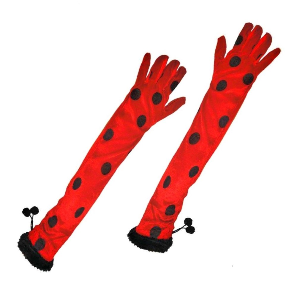 Dlouhé červené rukavice s puntíky jsou ideálním doplňkem pro karnevalové kostýmy berušky. Vyrobené z polyesteru a elastanu, nabízejí pohodlí a flexibilitu.