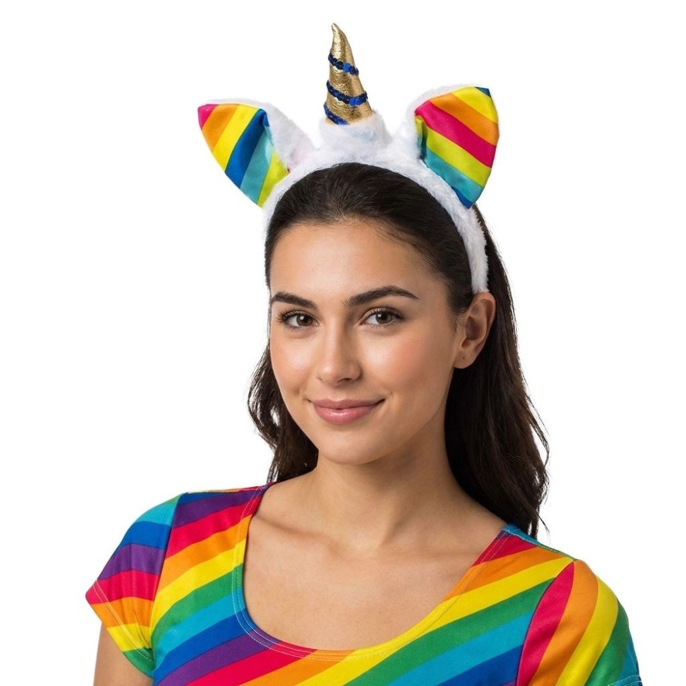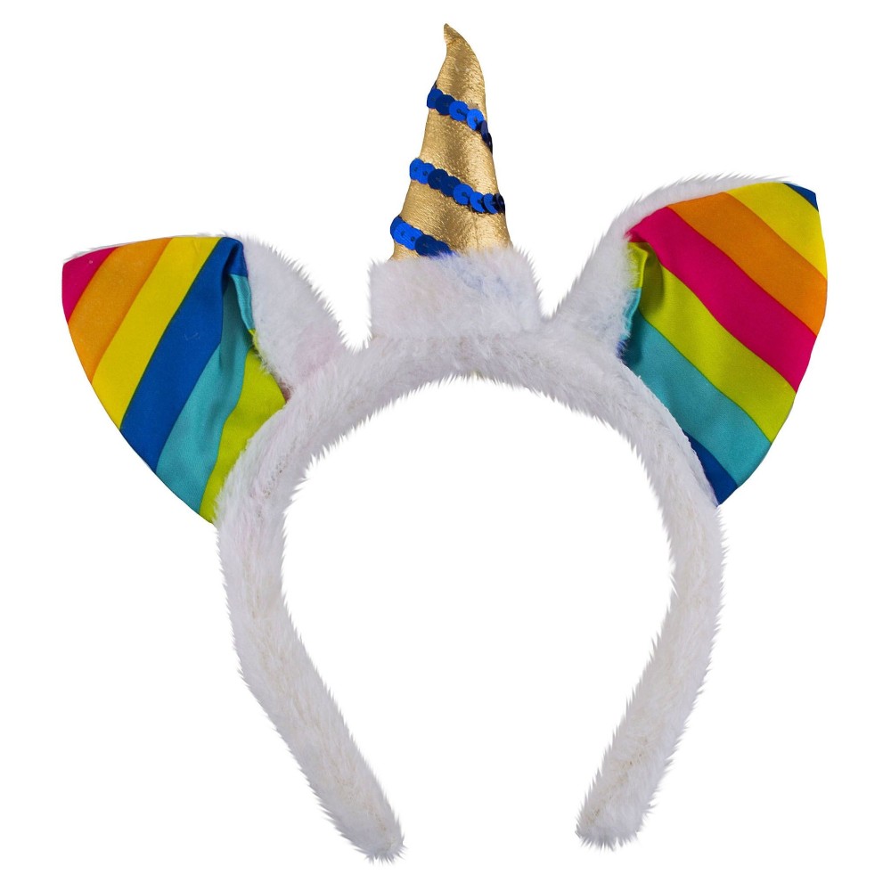 Chlupatá barevná čelenka jednorožec se zlatými oušky a rohem je perfektním doplňkem pro každou...