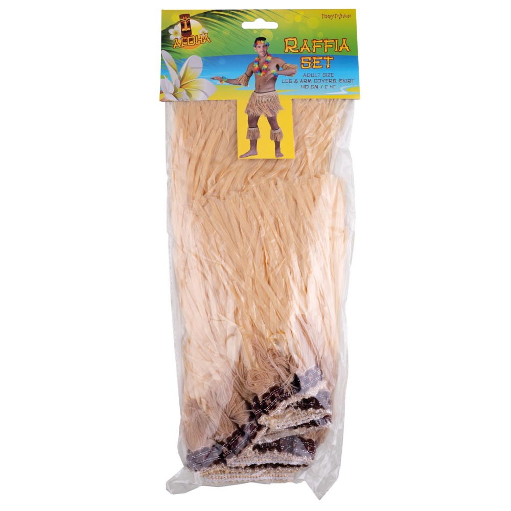 Havajský set karnevalových doplňků pro muže i ženy zahrnuje sukni, třásně na ruce a nohy, které skvěle doplní váš maškarní kostým nebo stylovou letní aloha párty.