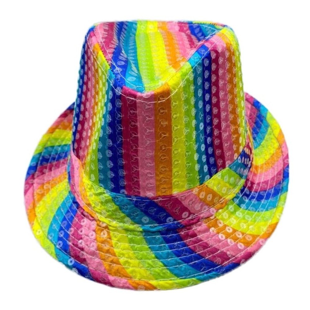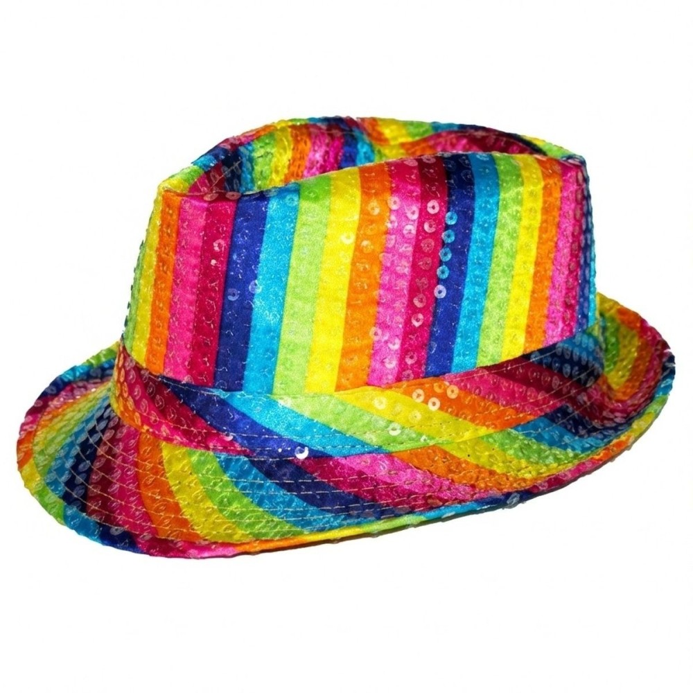 Barevný duhový klobouk fedora zdobený flitry je ideálním doplňkem pro každou karnevalovou nebo Pride párty. S vnitřním obvodem 58 cm je navržen pro dospělé, zajišťuje pohodlné nošení a stylový vzhled.