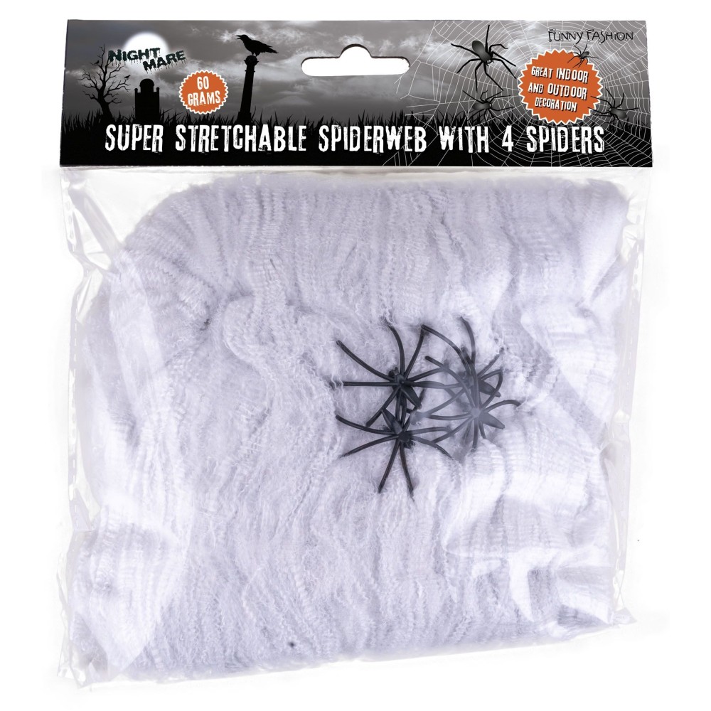 Dekorativní umělá pavučina s čtyřmi plastovými pavouky je perfektním doplňkem pro kostýmy čarodějnic a čarodějů a dotvoří každou Halloween hororovou párty nebo jinou tematickou akci. Tato sada obsahuje 60 gramů pavučiny, která je dostatečně hustá a roztažitelná, aby pokryla velké plochy a vytvořila realistický strašidelný efekt.