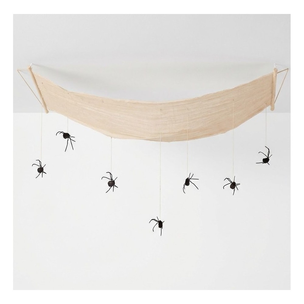 Bílá látka jako pavučina s pavouky je perfektní dekorací pro zavěšení ke stropu nebo mezi stromy na Halloween či strašidelnou párty. S rozměry 310 x 40 cm se snadno přizpůsobí různým prostorům a dodá vaší oslavě autentickou atmosféru.