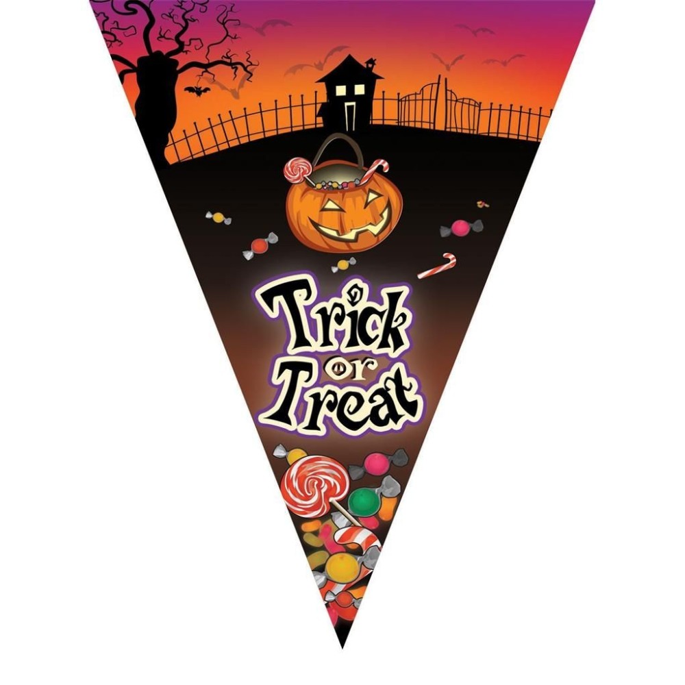 Plastová vlajková girlanda s motivem dýní a nápisem "Trick or Treat" je perfektní dekorací pro každou halloweenskou párty. S celkovou délkou přibližně 5 metrů a deseti výraznými vlajkami o velikosti 28 cm snadno ozdobí jakýkoli interiér či exteriér. Girlanda je vyrobena z odolného měkkého plastu, což zajišťuje její dlouhou životnost a možnost opakovaného použití.