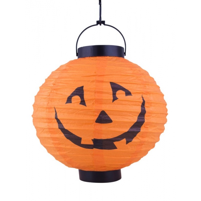Kulatý papírový lampion s průměrem 20cm, motivem vydlabané dýně a svítící LED je ideální dekorací pro strašidelnou Halloween párty.