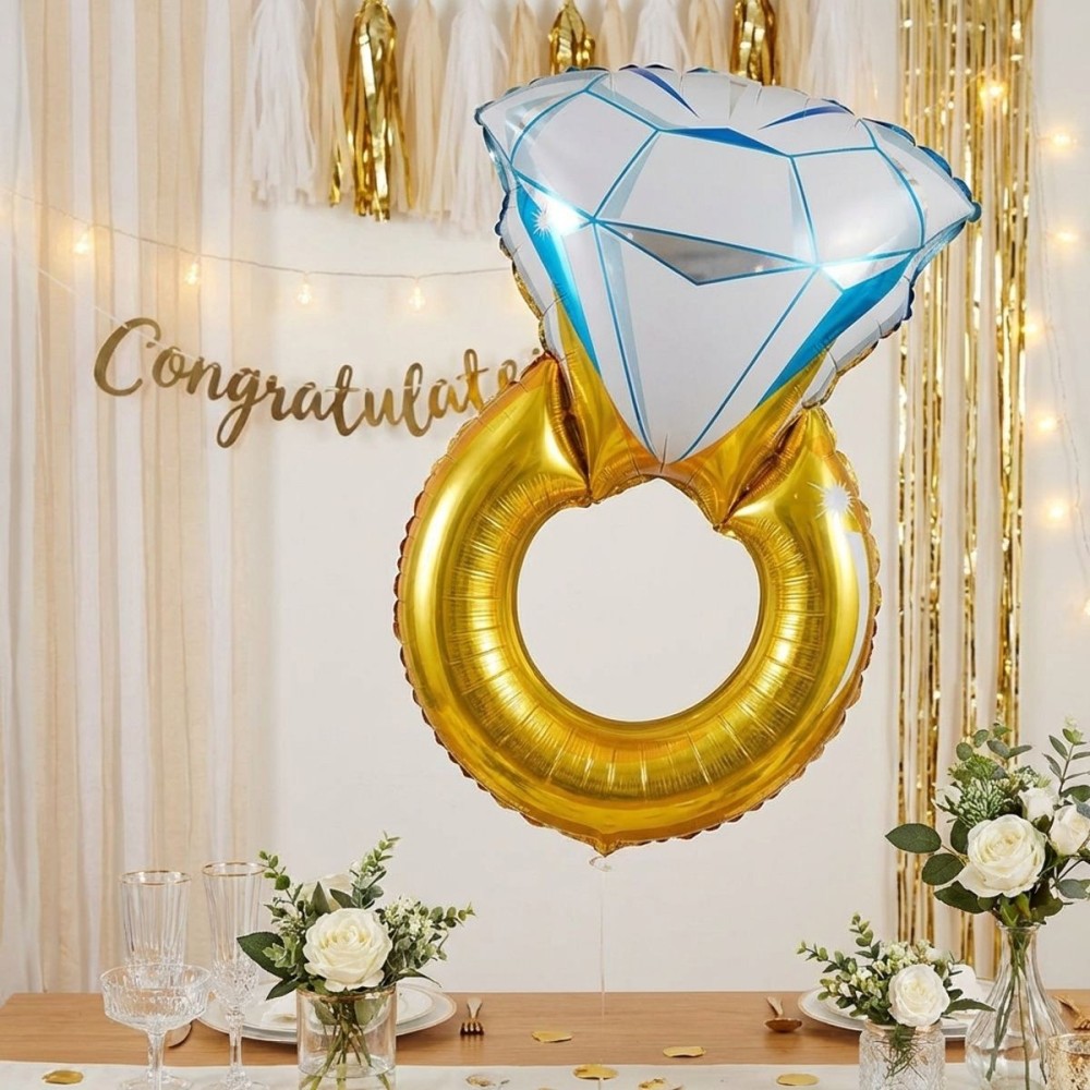 Velký foliový nafukovací balónek ve tvaru prstýnku s diamantem je dokonalým doplňkem pro zásnuby, svatby nebo stylové party. S rozměry 103 x 62 cm se stane výrazným prvkem každé oslavy a přitáhne pozornost všech hostů.