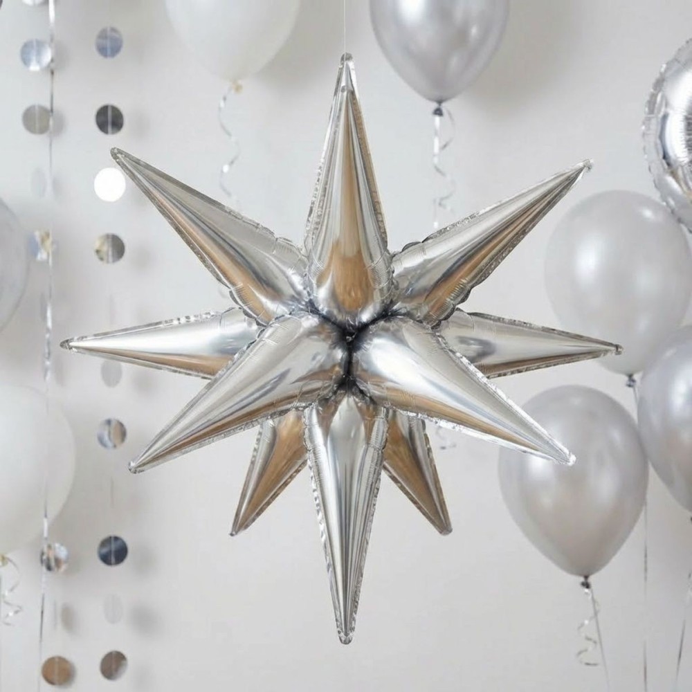 Prostorová foliová nafukovací balónková dekorace s 12 rameny, velikostí 67 cm a ve stříbrné barvě, je ideální dekorací pro každou stylovou party nebo narozeninovou oslavu. Perfektně se hodí i na Vánoce nebo novoroční oslavu, kde přidá slavnostní atmosféru.