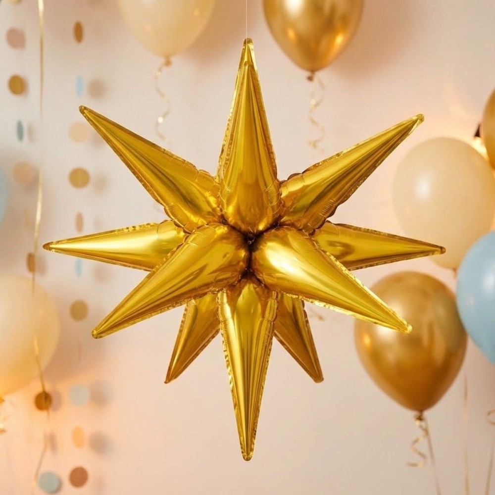 Prostorová zlatá foliová nafukovací dekorace o velikosti 67 cm - 12 balónků jako jednotlivá ramena - je ideální volbou pro vytvoření stylové a slavnostní atmosféry na každé party. Tento unikátní balónek je navržen tak, aby jednotlivé paprsky bylo možné nafukovat zvlášť, což usnadňuje jeho přípravu a manipulaci.
