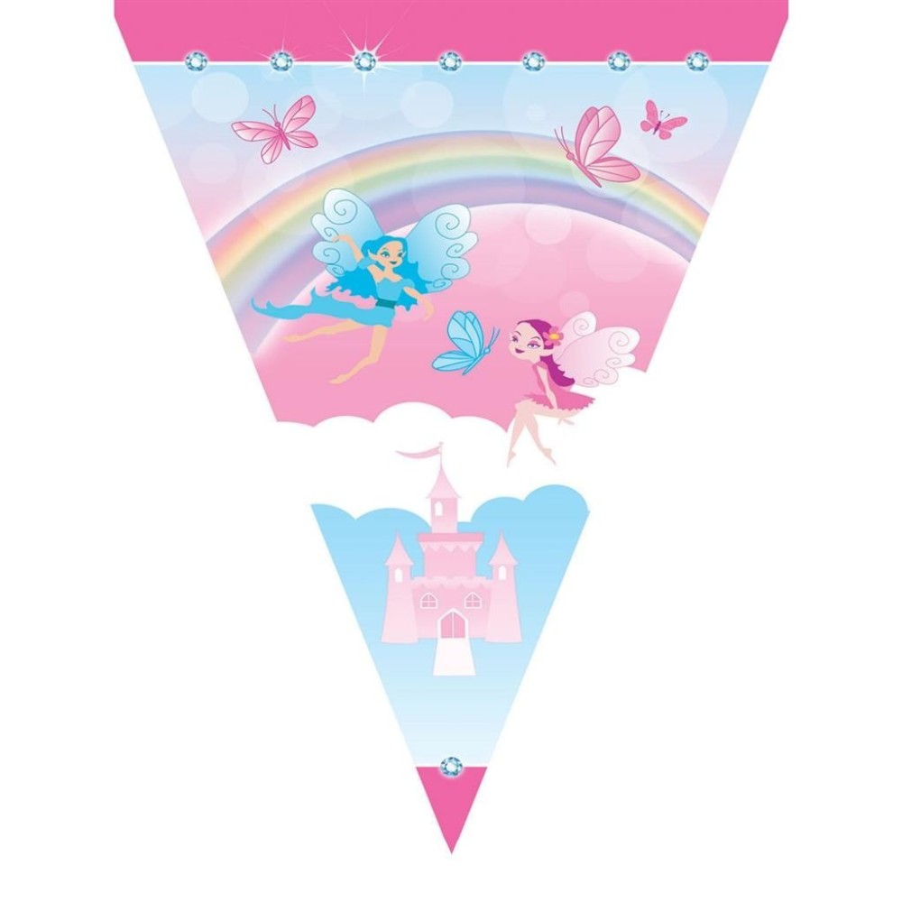 Plastová vlajková girlanda s pohádkovým motivem víl, duhy a zámku je ideální dekorací pro oslavu nebo párty malé princezny. S délkou přibližně 5 metrů a deseti vlajkami o velikosti 28cm skvěle ozdobí každý prostor.