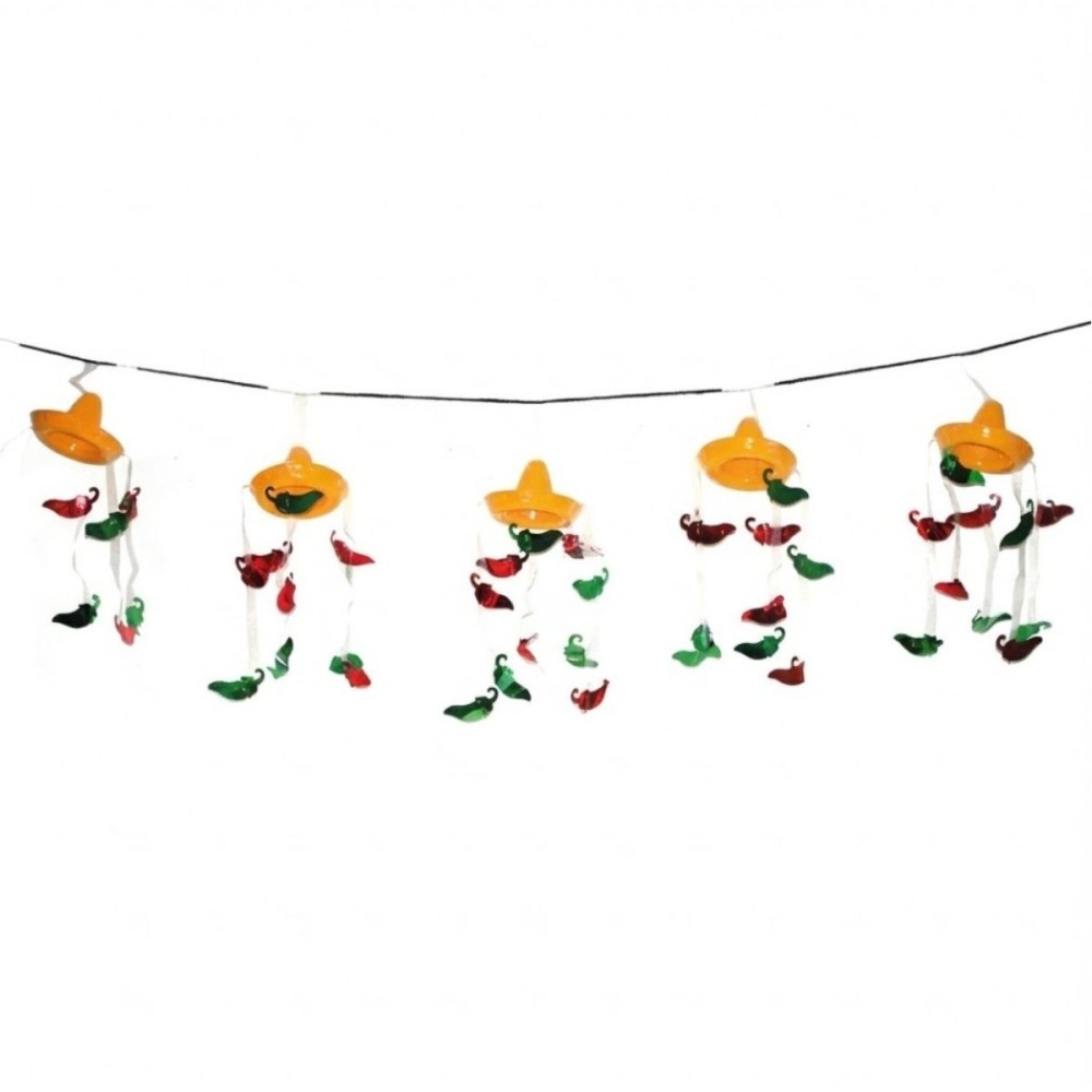 Barevná plastová girlanda s motivem 3D mexických klobouků sombrer a chilli papriček je skvělým doplňkem pro každou mexickou párty. S délkou přibližně 365 cm přináší živé barvy a tematický vzhled, který oživí každou oslavu.
