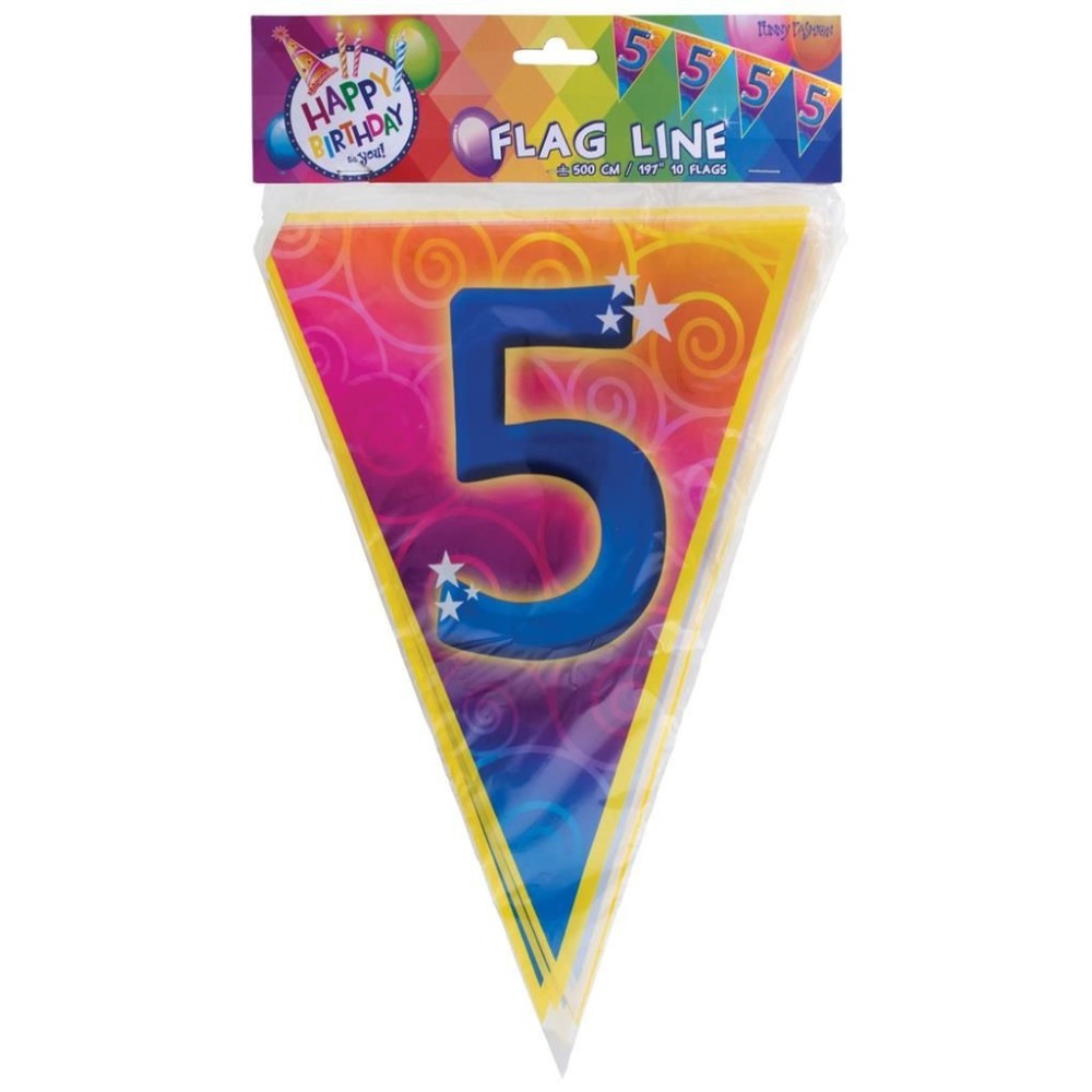 Plastová barevná narozeninová girlanda s velkým číslem 5 je ideální dekorací pro oslavu nebo narozeninovou párty. S délkou přibližně 5 metrů a deseti vlajkami o velikosti 28cm skvěle ozdobí každý prostor.