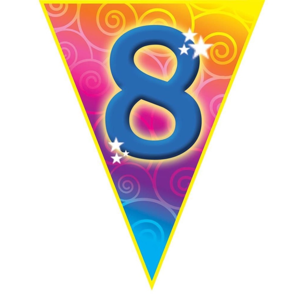 Plastová barevná narozeninová girlanda s velkým číslem 8 je ideální dekorací pro oslavu nebo narozeninovou párty. S délkou přibližně 5 metrů a deseti vlajkami o velikosti 28cm skvěle ozdobí každý prostor.
