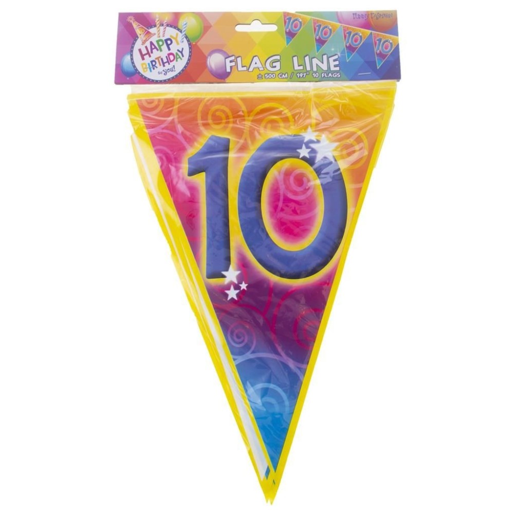 Plastová barevná narozeninová girlanda s velkým číslem 10 je ideální dekorací pro oslavu nebo narozeninovou párty. S délkou přibližně 5 metrů a deseti vlajkami o velikosti 28cm skvěle ozdobí každý prostor.