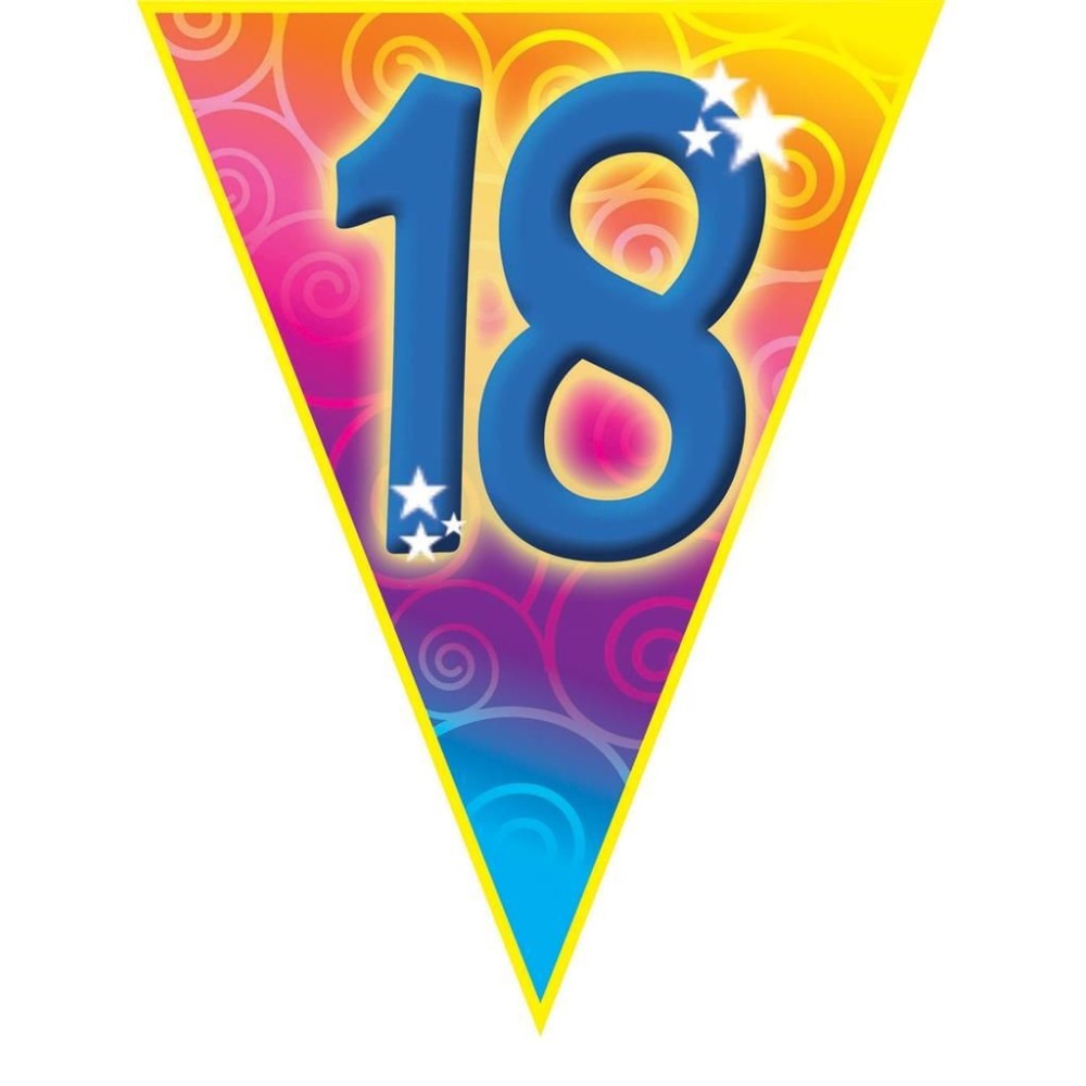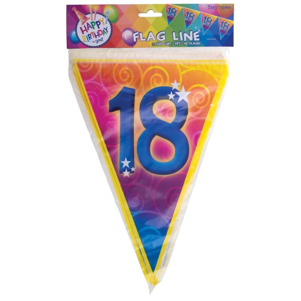 Plastová barevná narozeninová girlanda s velkým číslem 18 je ideální dekorací pro oslavu nebo narozeninovou párty. S délkou přibližně 5 metrů a deseti vlajkami o velikosti 28cm skvěle ozdobí každý prostor.