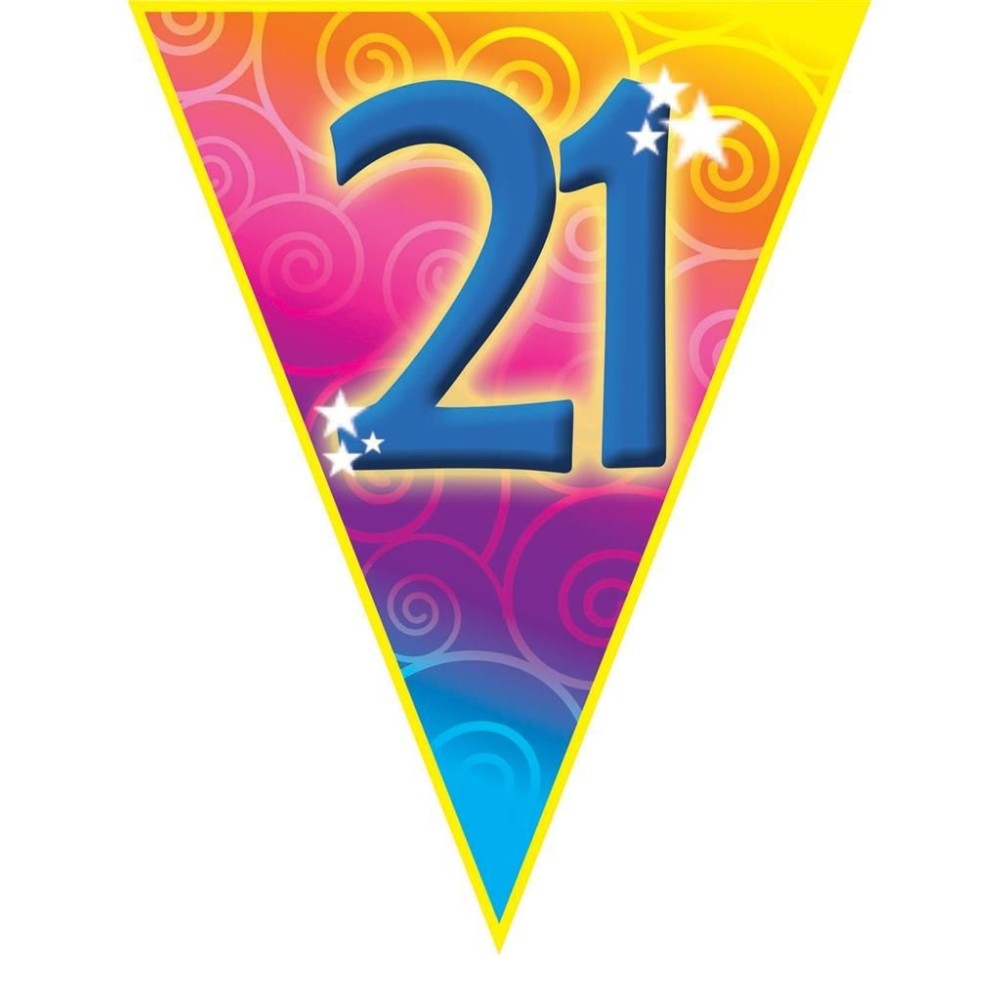 Plastová barevná narozeninová girlanda s velkým číslem 21 je ideální dekorací pro oslavu nebo narozeninovou párty. S délkou přibližně 5 metrů a deseti vlajkami o velikosti 28cm skvěle ozdobí každý prostor.