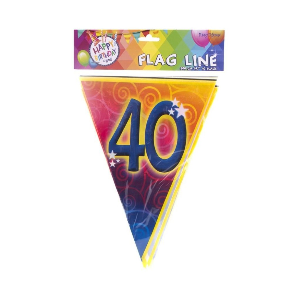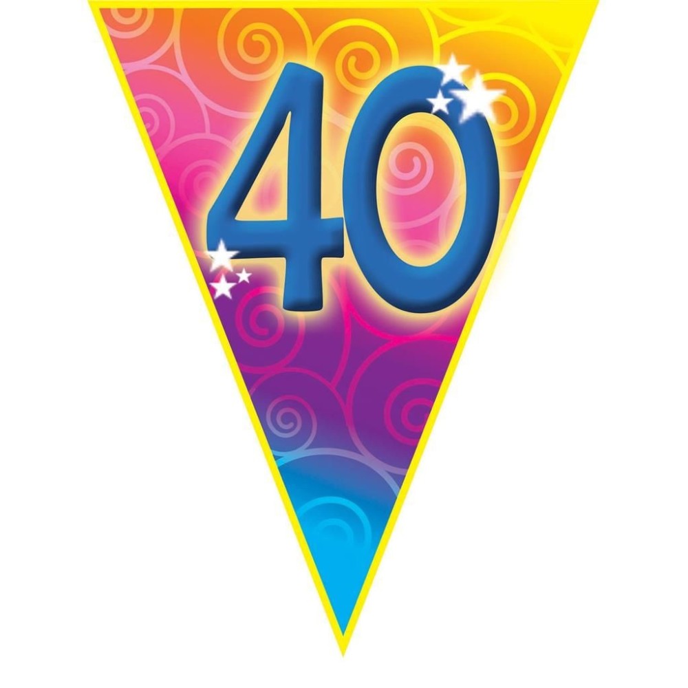 Plastová barevná narozeninová girlanda s velkým číslem 40 je ideální dekorací pro oslavu nebo narozeninovou párty. S délkou přibližně 5 metrů a deseti vlajkami o velikosti 28cm skvěle ozdobí každý prostor.