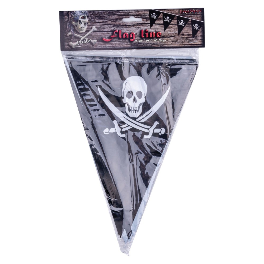 Plastová vlajková girlanda s pirátským motivem lebky a šavlí je perfektní dekorací pro každou letní námořnickou párty. S celkovou délkou přibližně 5 metrů a deseti výraznými vlajkami o velikosti 28 cm snadno ozdobí jakýkoli interiér či exteriér. Girlanda je vyrobena z odolného měkkého plastu, což zajišťuje její dlouhou životnost a možnost opakovaného použití.