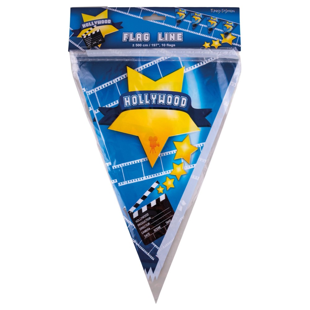 Plastová vlajková girlanda s motivem filmové hvězdy a klapky je ideální dekorací pro vaši oslavu nebo párty v hvězdném filmovém stylu. S délkou přibližně 5 metrů a deseti vlajkami o velikosti 28cm skvěle ozdobí každý prostor.